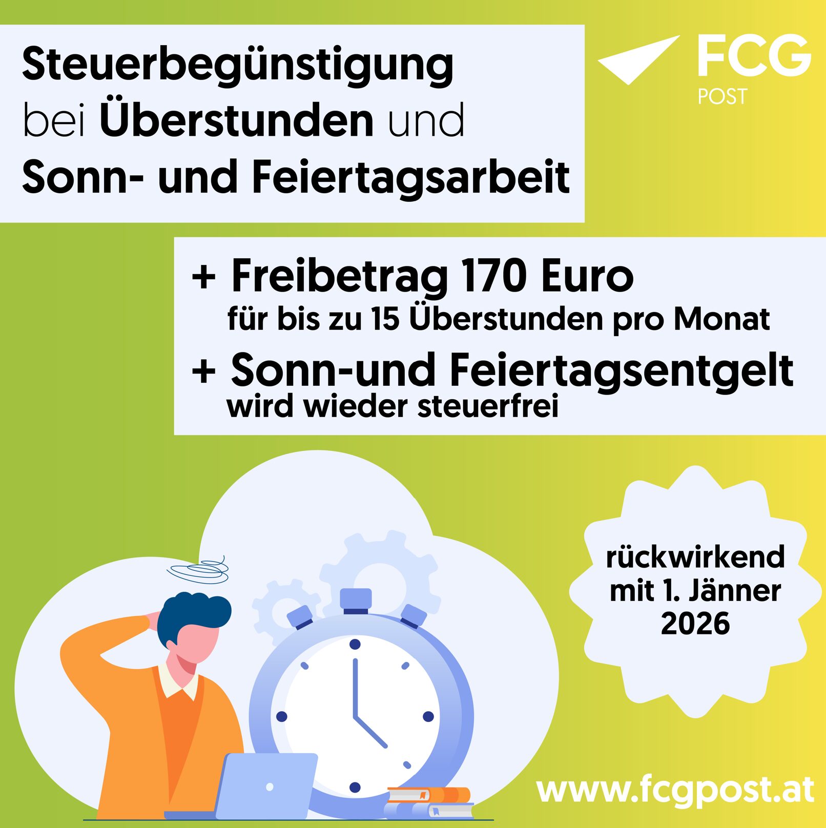 Im heurigen Jahr 2026 wird der Freibetrag von 170 Euro für bis zu 15 Überstunden pro Monat betragen. Außerdem wird jetzt gesetzlich klargestellt, dass das Sonn- und Feiertagsentgelt wieder steuerfrei ist. Diese Steuerbefreiung war infolge eines Urteils des Bundesfinanzgerichts aufgehoben worden.